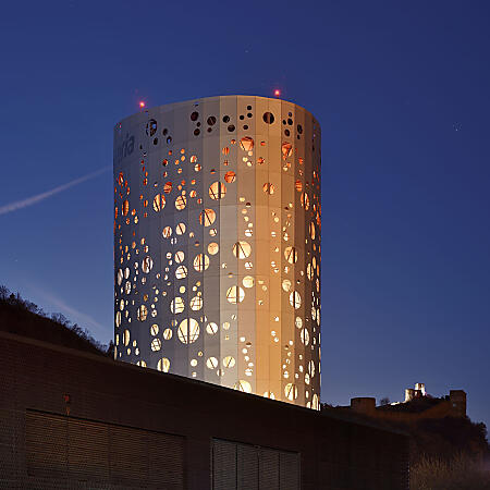 Der neue 43 Meter hohe Turm, welcher von der Atzwanger AG zusammen mit Partnerfirmen errichtet wurde, speichert die Energie aus der Abwärme des Müllverbrennungsofens und wird die Spitzenlasten der Wärmeabnahme des Fernheiznetzes ausgleichen. Um den Speicher architektonisch aufzuwerten, wurde dieser mit einer hinterleuchteten Aluminiumfassade verkleidet. Durch unterschiedlich große Löcher in der Verkleidung, welche Wasserblasen nachbilden, in Kombination mit mehrere hundert LEDs, entsteht am Abend ein beeindruckendes Farbenspiel.