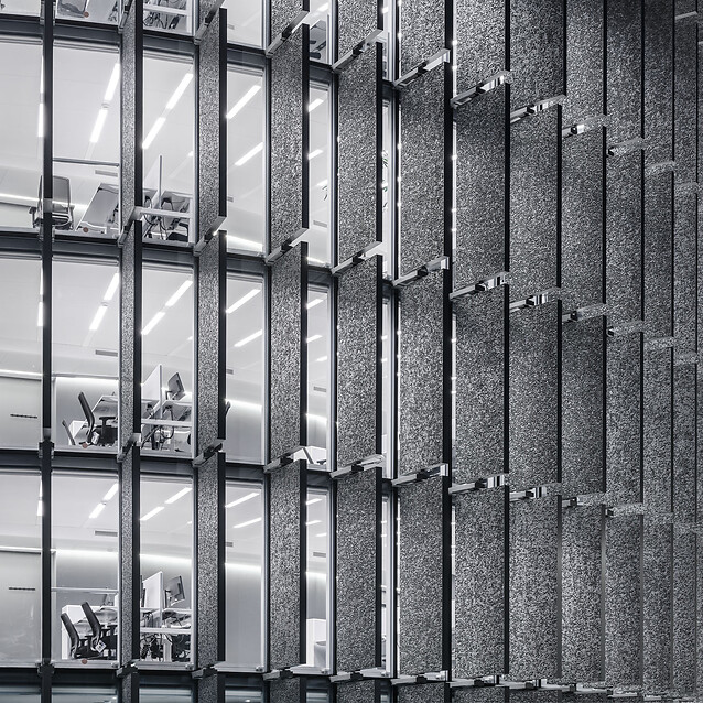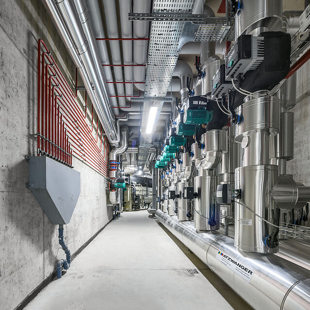 Our team at ATZWANGER also implemented the drinking water and wastewater system, including the rainwater recovery system for both irrigation and toilet flushing. Decorative highlight: the water treatment system for the reflecting pool between the two buildings. With a depth of 30 cm, the water mirror covers an impressive 2,000 m2 surface area!