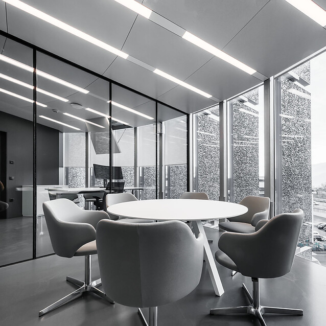 L'impianto di riscaldamento e raffreddamento soddisfa gli standard più elevati.” Per il comfort degli uffici e dei circa 300 dipendenti, abbiamo adottato in parte il soffitto radiante metallico con valvole a 6 vie per una regolazione indipendente di ogni singolo ambiente, in parte il riscaldamento a pavimento, oltre che a numerosi ventilconvettori”, sottolinea l’esperto. A ciò si aggiunge l’impianto di ventilazione, dove con 6 unità di trattamento aria e diversi recuperatori provvediamo ai ricambi dell’aria. “E tutto su misura, perché con la forma ellittica dell'edificio i moduli standard non funzionano”, aggiunge Ciprian.