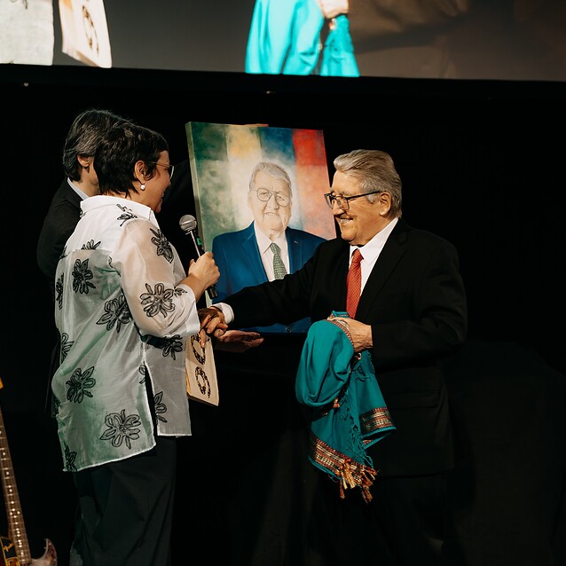 I collaboratori e le collaboratrici di tutte le sedi del gruppo ATZWANGER hanno sorpreso il presidente emerito con un regalo molto speciale: un ritratto realizzato dall'artista Margit Köhl.